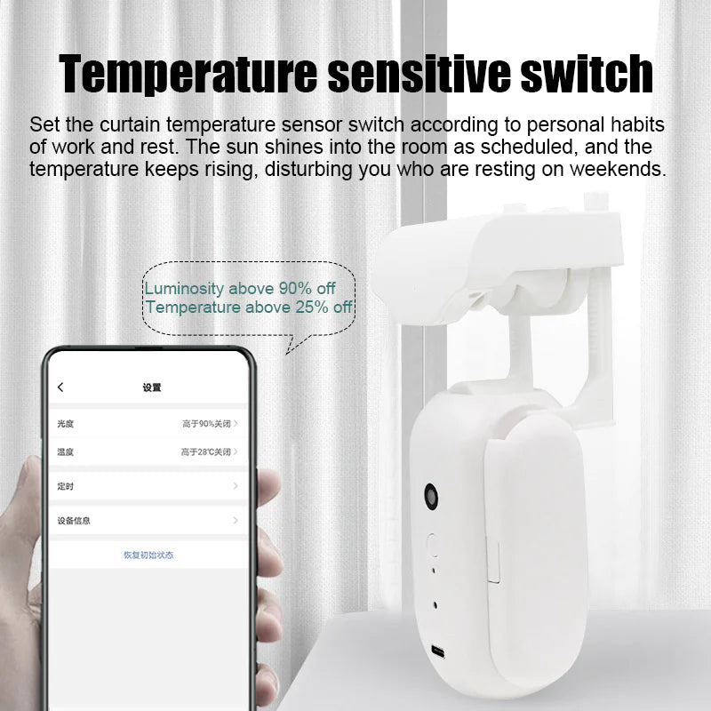 Our Automatic Curtain Opener lets you open and close your curtains with the touch of a button — or on a set schedule. Enjoy waking up to natural light, better energy efficiency, and effortless comfort, all controlled by smartphone.
